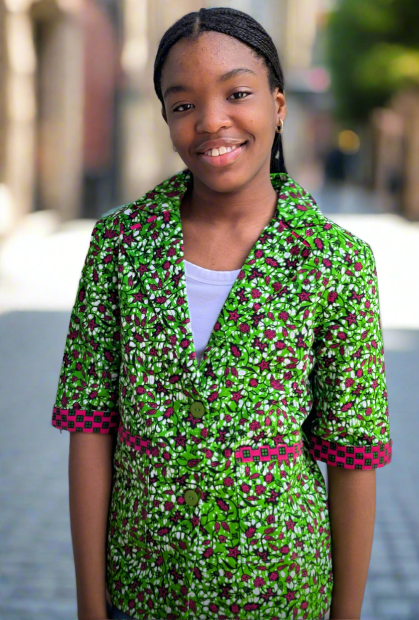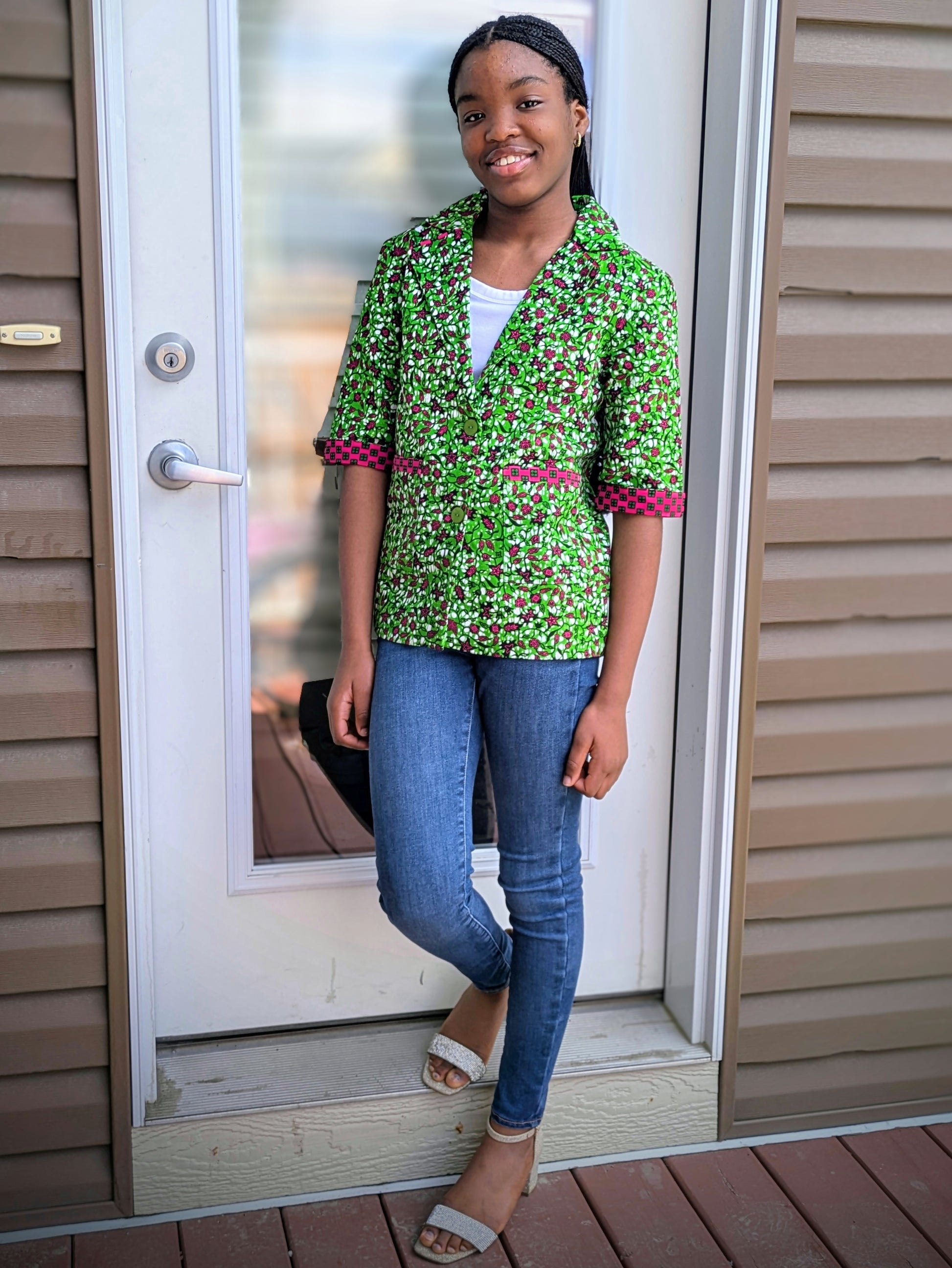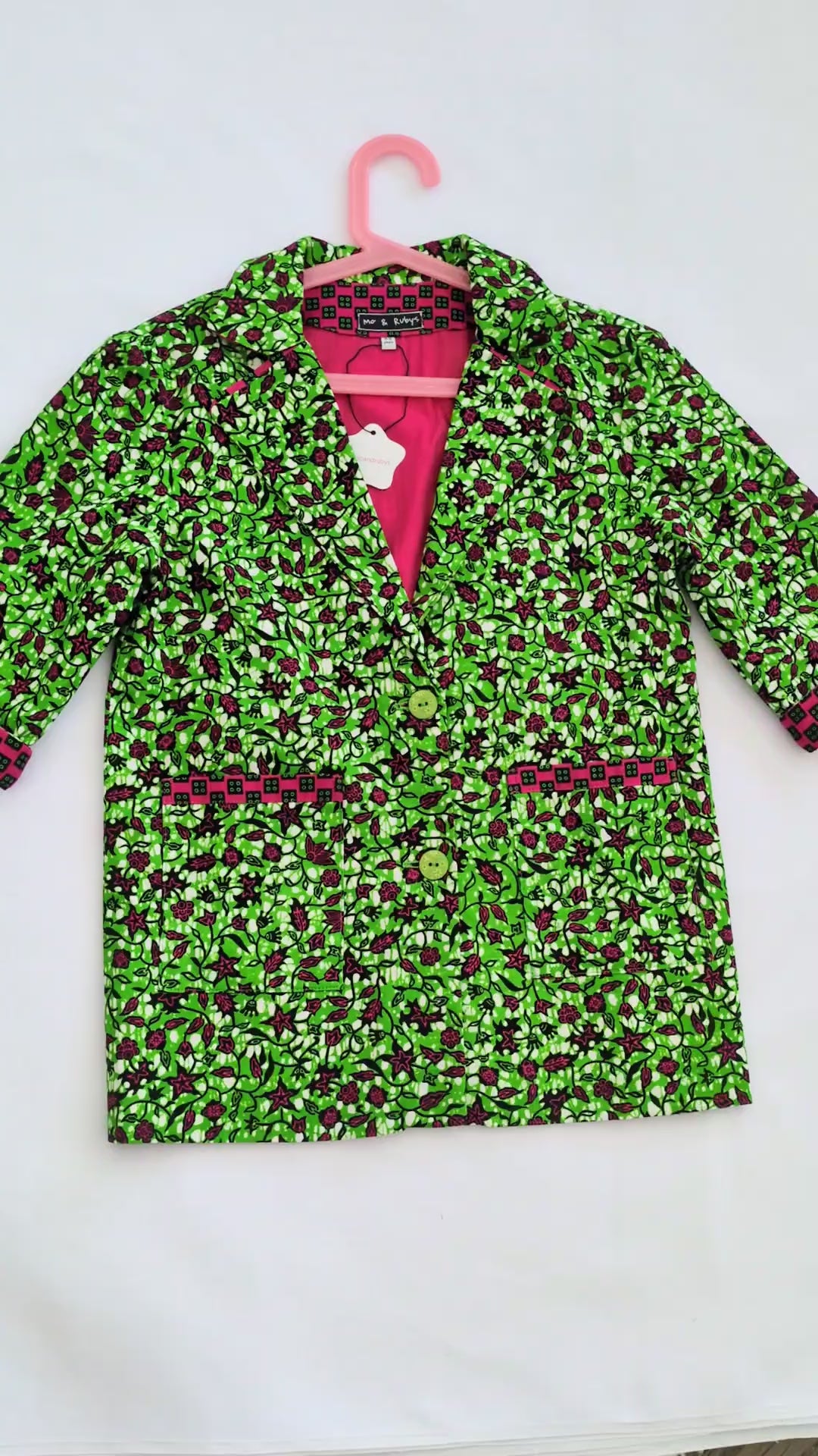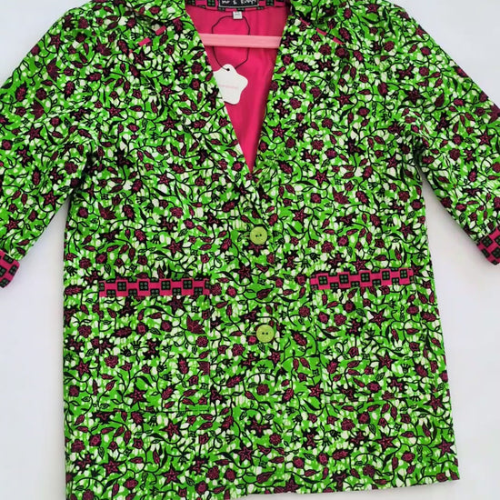 Crafted from rich, authentic African wax fabric, this 3/4 sleeve length Jacket features bright cotton contrast lining that adds a bold pop when styled open.